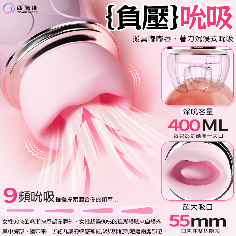 負壓沉浸吮吸: 400ML 的深吮大容量,配合 9 頻強勁吸力,針對 90% 的敏感區域進行精準刺激,引爆如潮汐般的深層顫慄。