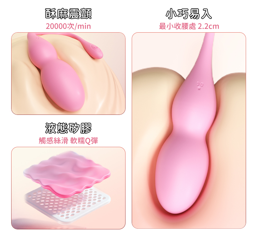 - 功能升級:普通產品僅有單一震動,功能單一,無法滿足更深層需求。我們設計獨特鍛煉球造型設計,在律動中自然鍛煉盆底肌。
